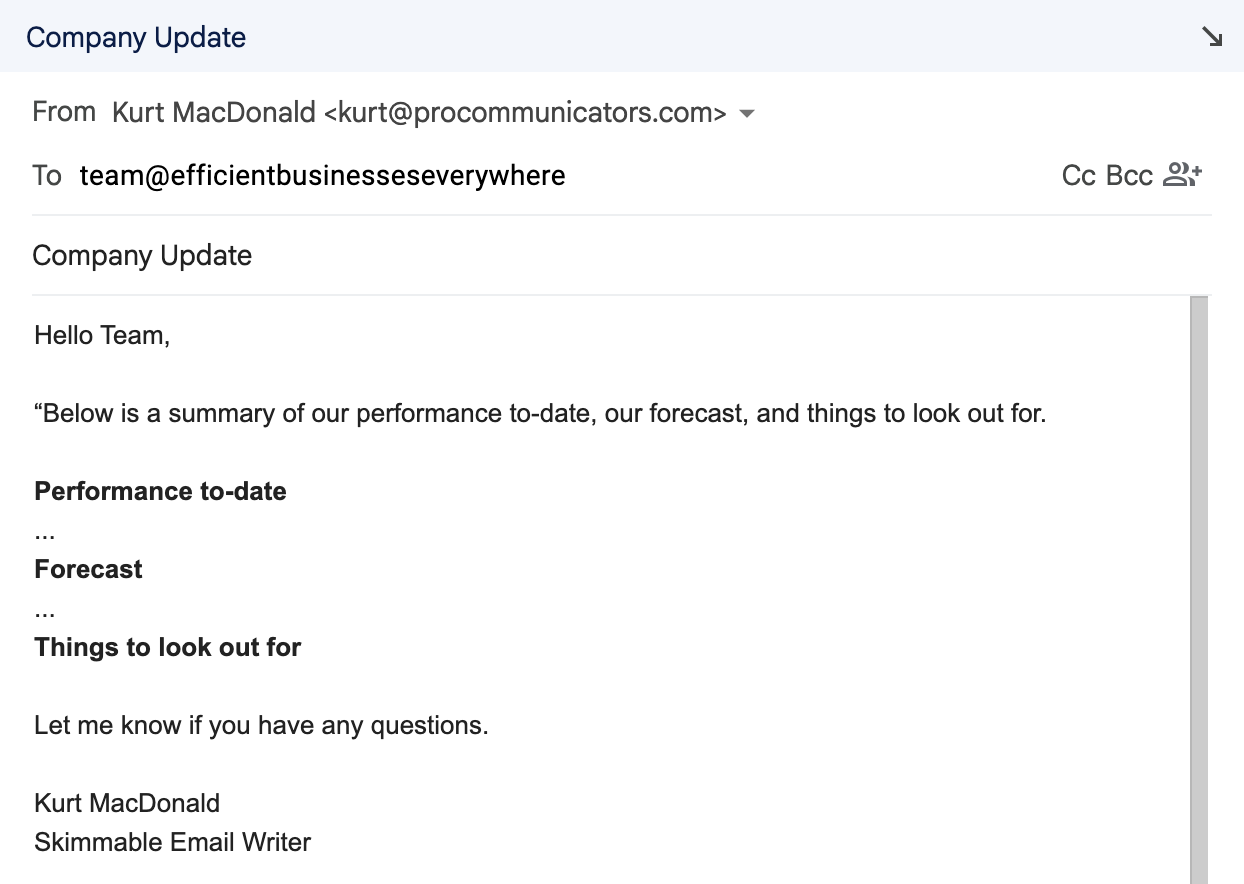 Including a single sentence that efficiently summarizes the contents of the email, followed by bolded headings, dramatically reduces the “read time” of your emails.